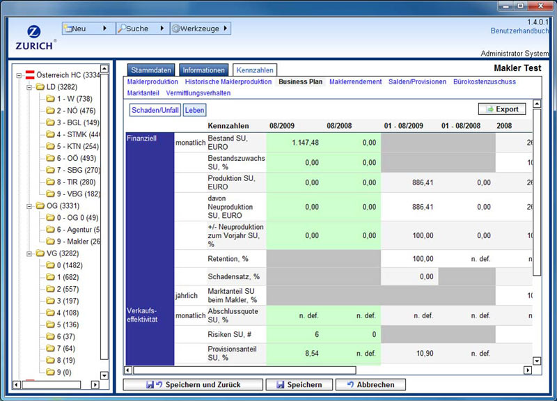 Per soddisfare questo requisito, è stato creato un sistema online di banca dati centrale per le vendite dei broker. I dati distribuiti su un totale di 12 sottosistemi, sono stati congiunti, aggregati e preparati graficamente. Il risultato è stato un cockpit di gestione per l’ottimizzazione del processo decisionale ed un efficace supporto al broker.